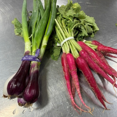 Even after 9 years at PCF, there is always something cool or unusual to see in our warehouse. This photo has both cool and unusual all rolled into one. On the left are the Organic Red Spring Onions (26709-12 ct) and on the right are Cincinnati Red Radishes (33875-24 ct). Cool thing about the radishes is the tops start off with a citrus note much like Sorrel (21189-1 lb). Why not combine the two into a dish- Grilled Spring Onions and Cincinnati Radishes? Best to keep it simple for this time of year. Clean the radishes, leaving the tops on and toss with EVOO, Sea Salt and Pepper. Set aside. Do the same for the Red Spring Onions. Throw on the hot grill until they heat thru and get a nice grill mark. When done, arrange on the plate. Might as well add a grilled piece of Halibut – I hear that the season opened finally. Only else would be a nice lemony butter sauce to give it some richness. Grilled Radishes, you say? Yes radishes are excellent roasted, grilled, or sautéed.